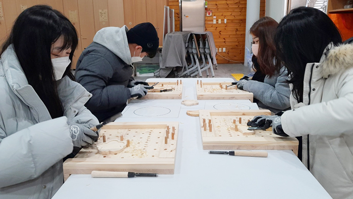 성인을 대상으로 1월과 2월 두 달 동안 영인산 산림교육장에서 운영되는 이번 체험 프로그램은 참가자가 나무 조각을 직접 깎아 나뭇잎 수저받침, 달과 꽃 모양 소접시 등 나만의 소품을 만들어 무료로 가져갈 수 있도록 했다.