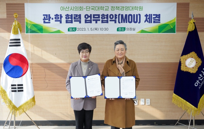 [아산시의회] 아산시의회(의장 김희영)가 지난 5일 오전 의장실에서 단국대학교 정책경영대학원(원장 이영애)과 상호 공동 협력 체계 구축을 위한 협약을 체결했다.