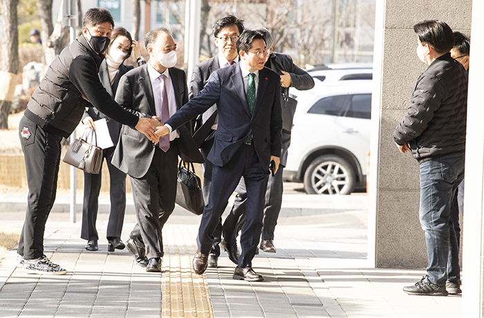 지난 1일 오전 박경귀 아산시장이 법원에 출석했을 때 지지자들 일부가 박 시장을 맞았다. 이들은 심리를 마치고 법원을 빠져 나가는 박 시장을 향해 ‘박경귀는 무죄다’라고 외치기도 했다.