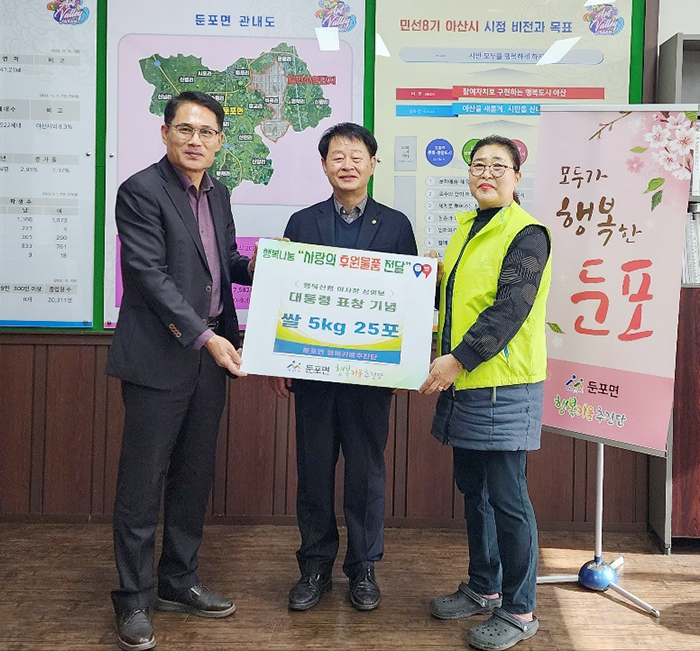[아산신문] 둔포면 소재 행복신협(이사장 심영보)이 지난 3일 둔포면 행복키움추진단(공공단장 최경만, 민간단장 유영숙)에 백미 5kg 25박스를 후원했다.