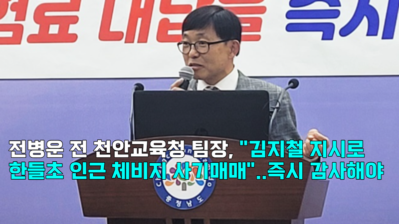 - 천안교육지원청에서 시설기획팀장으로 있었던 전병운 씨가 김지철 충남교육감의 지시로 천안 한들초등학교 학교부지 체비지 사기매매 및 보증보험료 대납이 진행됐다며 교육당국에 이에 대한 감사를 촉구했습니다.