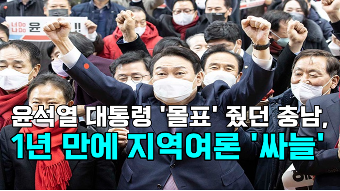 - 지난 9일은 윤석열 정부 출범 1주년을 맞는 날이었습니다. 지난해 치러진 제20대 대통령선거에서 윤석열 대통령은 충남에서 51.08% 지지를 얻어 경쟁자였던 더불어민주당 이재명 후보에 6%p 차 승리를 거뒀습니다. 하지만 1년이 지난 지금 충남지역 여론은 싸늘하기만 합니다.
