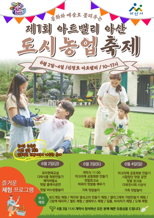 [아산신문] 아산시가 도시농업과 문화예술 교류의 장을 열어줄 제1회 아트밸리 아산 ‘도시농업축제’를 다음달 2일부터 4일까지 사흘간 신정호 잔디광장에서 개최한다.