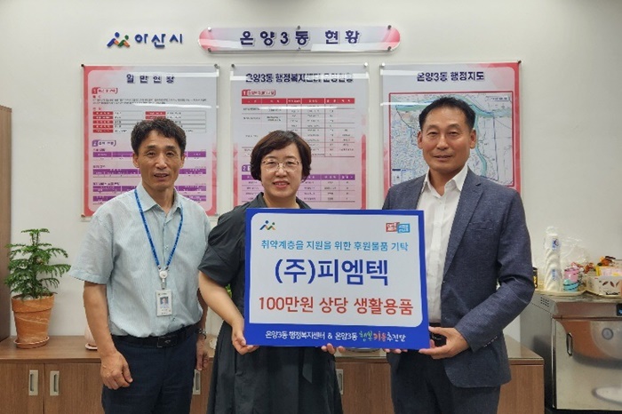 [아산신문] 아산시에 소재한 ㈜피엠텍(대표 김승규)가 어제(20일) 온양3동을 방문해 생활용품(100만 원 상당)을 기부했다고 밝혔다.
