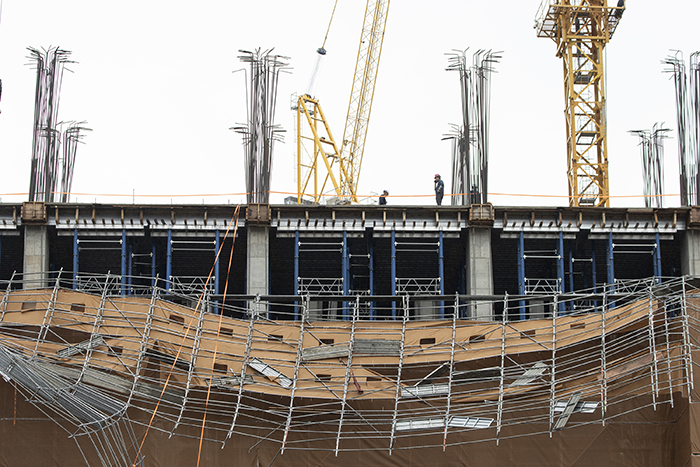 이날 오전 탕정면 용두리 지식산업센터 신축공사 현장에선 작업 가시설물인 외부 시스템 비계가 휘어지는 사고가 발생했다.