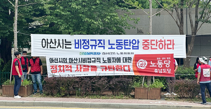 앞서 네 개 진보정당은 아산시가 비정규직지회 윤영숙 지회장에 대해 부당 징계를 가했다며 이를 규탄하는 현수막을 내걸었다. 하지만 아산시 옥외광고물팀은 이 같은 현수막 내용이 통상적 정치현안이 아니라며 철거했다.(관련 기사 : http://www.assinmun.kr/news/view.php?no=11667)