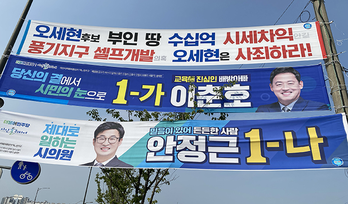 이 현수막엔 '오세현 후보 부인땅 수십억 시세차익 안길 풍기지구 셀프개발 의혹 오세현은 사죄하라'는 글귀가 적혀 있었다. 그런데 글귀 중 '의혹'과 '안길'이란 낱말은 의도적으로 작은 글씨로 처리해 자세히 관찰하지 않으면 볼 수 없게 해놓았다. 그래서 멀리서 보면 '오 후보가 풍기지구 셀프개발로 부인에게 시세차익을 안길 것'이란 부정적 인상을 준다. 꼼수란 지적이 나오는 대목이다.
