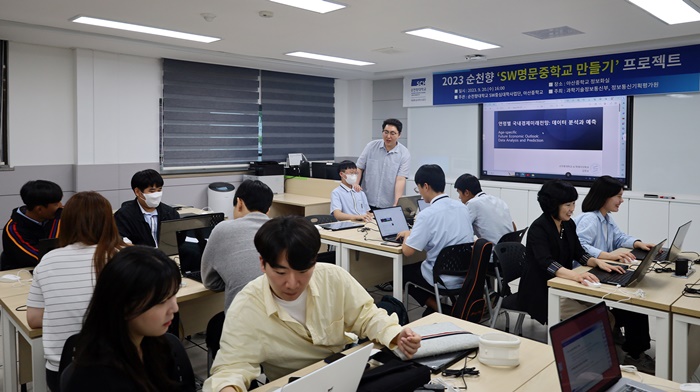 ‘SW 명문중학교 만들기’ 프로그램은 순천향대 SW중심대학사업단 SW가치확산센터가 주관하며, AI·SW 역량 강화 프로그램에 관심이 많은 지역 소재 ‘아산중학교’를 선정해 AI·빅데이터학과 문지훈 교수와 SW 관련 학과 재학생을 중심으로 오는 11월까지 SW 멘토링을 실시하는 프로그램이다.