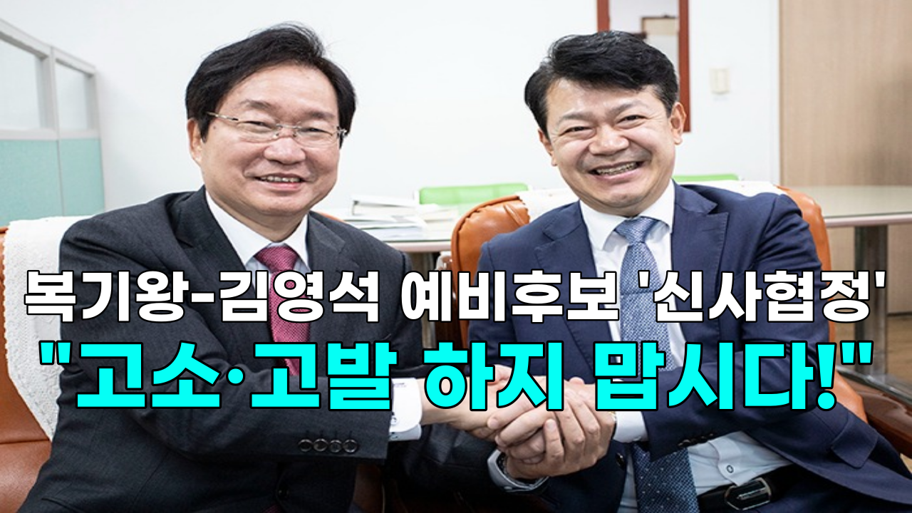 - 예비후보 등록 첫날인 12일, 아산시선관위엔 김영석 전 해양수산부 장관과 더불어민주당 복기왕 위원장이 나란히 1번과 2번으로 예비후보 등록을 마쳤습니다. 두 예비후보는 서로 고소 고발하지 말자며, 두 손을 맞잡았습니다. 지유석 기자가 전합니다.