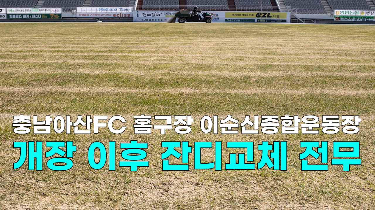- 충남아산FC는 지난 9일 이순신종합운동장에서 부천FC와 홈 개막경기를 치렀습니다. 그런데 경기장 잔디 상태는 눈으로 보기에도 엉망이었습니다. 홈팀 충남아산FC 김현석 감독과 원정팀 부천FC 이영민 감독 모두 잔디 상태를 두고 불만을 숨기지 않았습니다.