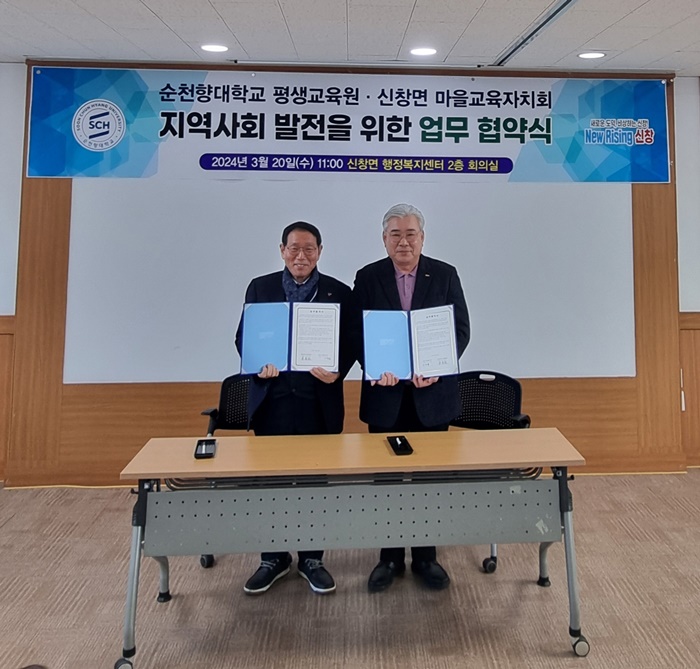 [아산신문] 아산시 신창면 마을교육자치회가 순천향대학교 평생교육원과 지난 20일 지역사회 발전을 위한 업무협약을 체결했다.