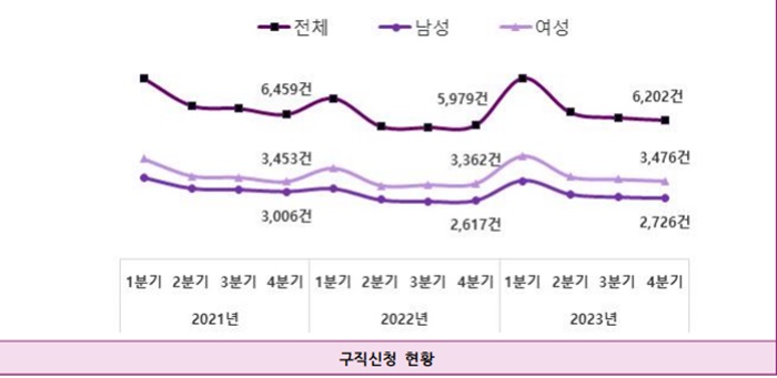 또한 2023년 4분기 여성들의 구직신청 현황은 3476건으로, 전년 같은 분기 대비 114건 증가해 매년 여성들의 구직 신청이 높아지는 것을 확인할 수 있었다.