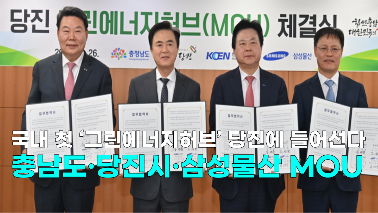 충청남도는 지난달 26일 오성환 당진시장, 강기윤 한국남동발전 사장, 이병수 삼성물산 부사장이 참석한 가운데 당진 그린 에너지 허브 성공을 위한 업무협약을 체결했습니다.