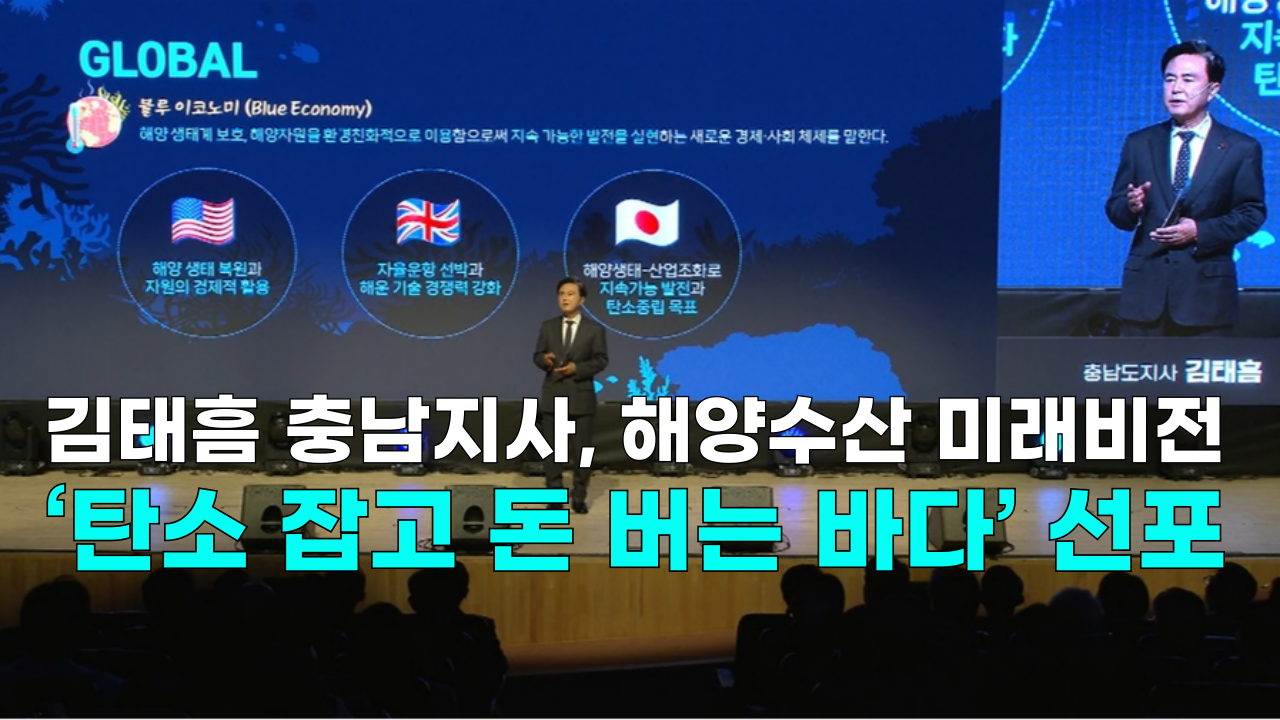 - 김태흠 충남지사가 지난 5일 당진시청에서 충남 해양수산 미래비전을 선포했습니다. ‘미래를 품은 바다, 블루엔진 충남'이란 슬로건으로 2035년까지 13조원 투입해 충남에 세계 최고 블루카본 생태계를 조성한다는 게 미래비전의 핵심 뼈대입니다. 김 지사는 "대한민국의 미래를 바꾸겠다"는 포부를 밝혔습니다. 이현자 기자가 자세한 내용 전합니다.