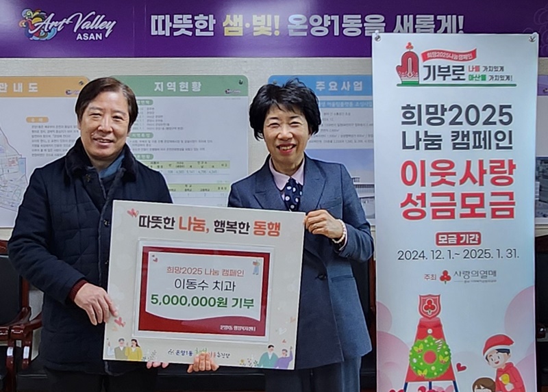 [아산신문] 이동수 치과 의원(원장 이동수)은 지난 19일 온양1동 행정복지센터를 찾아 ‘희망 2025 나눔 캠페인’에 500만 원을 기부했다고 밝혔다.