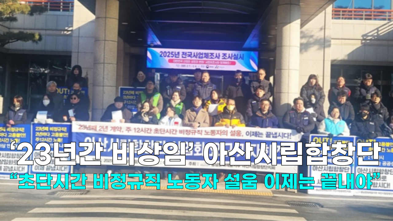 공공운수노조 충남문화예술지부 아산시립합창단지회는 지난달 24일 아산시청 앞에서 기자회견을 열고 23년째 2년 계약, 주 12시간 근무라는 ‘초단시간’의 비정규직 설움을 이제는 끝내고 싶다고 목소리를 높였습니다.