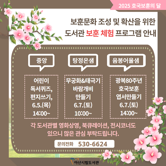 주요 프로그램은 호국영웅과 국가의 의미를 되새길 수 있는 ▲영화상영 ▲북큐레이션 ▲전시 ▲온라인 사진전 등이며, ▲중앙도서관 ‘어린이 독서퀴즈’ ▲탕정온샘도서관 ‘무궁화·태극기 바람개비 만들기’ ▲음봉어울샘도서관 ‘광복 80주년 호국보훈 엽서 만들기’ 등 다양한 체험 프로그램도 운영된다.