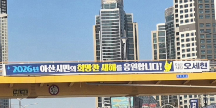 [아산신문] 아산시 관내 주요 도로에 게시된 신년 인사 현수막을 두고 시민 혈세 사용의 적절성과 행정 홍보의 정치적 중립성을 둘러싼 논란이 이어지고 있다. 해당 현수막에는 ‘2026년 아산시민의 희망찬 새해를 응원합니다’라는 문구와 함께 오세현 아산시장 개인 명의가 명시돼 있어, 공적 행정 홍보물로 보기에는 부적절하다는 지적이 나온다.