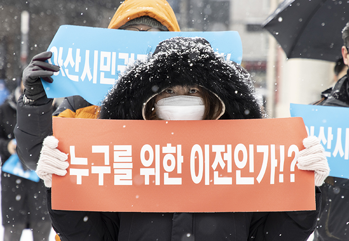 이날 오전부터 아산시엔 눈이 내렸다, 그러나 궂은 날씨에도 아랑곳없이 시민대회는 예정대로 열렸고, 민주당 시·도의원과 시민단체 회원 등 40여 명이 참여했다.