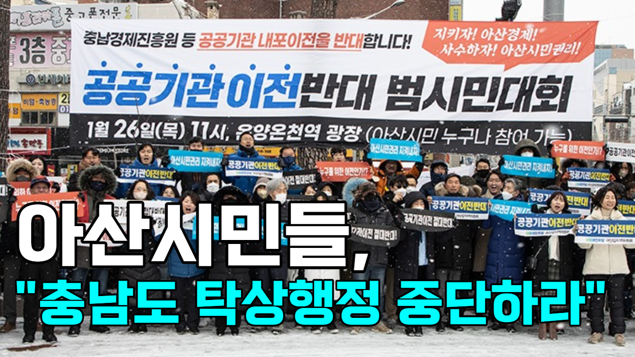 - 공공기관 내포 이전 반대 범시민대회가 지난 26일 오전 아산시 온양온천역 광장에서 열렸습니다. 이날 오전부터 아산엔 눈이내리는 등 날씨가 고르지 않았지만 시민대회는 예정대로 열렸고, 참가자들은 한 목소리로 공공기관 이전 반대 목소리를 냈습니다. 참가자들은 충남도가 아산시민을 무시하는 탁상행정을 하고 있다고 비판했습니다.