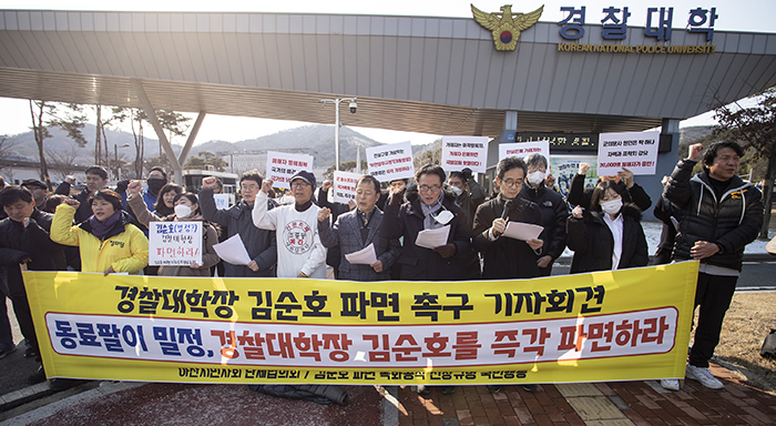 이들은 김순호 경찰대학장의 과거 이력을 거론하며 “이번 인사는 민주화운동을 전면 부정하는 것으로 민주주의를 파괴하는 일이며 과거 권위주의 정권이 행했던 것과 같이 자신들의 정권 안보를 위해 공공안전 담당기구를 정권 안전 기구로 만들려는 시도”라고 규탄했다.