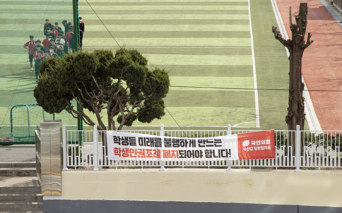 이런 와중에 보수 여당인 국민의힘 아산갑당원협이 버젓이 아산고 담벼락에 학생인권조례 폐지를 찬성하는 현수막을 내건 것이다.