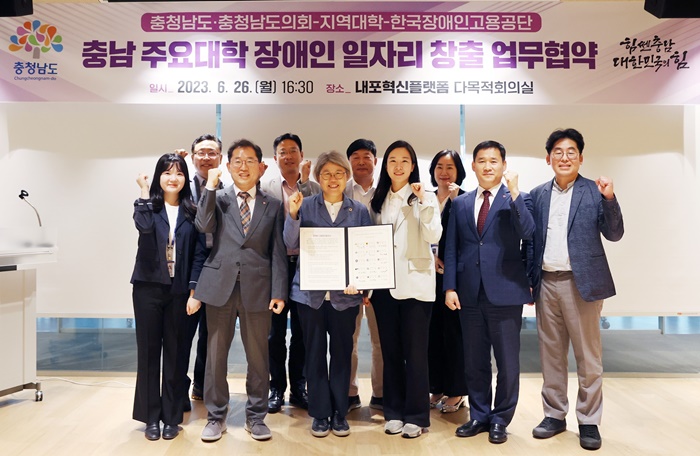 [아산신문] 충남도회의(의장 조길연)는 어제(26일) 내포혁신플랫폼 다목적회의실에서 충남도, 한국장애인고용공단, 12개 대학과 함께 장애인 일자리 창출 업무협약을 체결했다고 밝혔다.