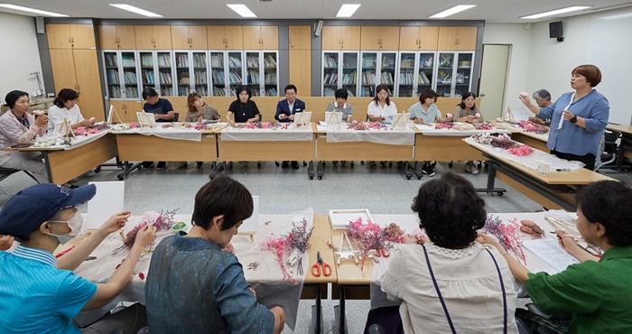 이날 박 시장은 농촌 여성 학습동아리 치유원예반 회원 23명을 만나 플라워 액자 만들기를 함께하며 아산시정과 농업인에 관한 이야기를 나눴다.