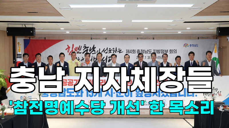 - 충남의 15개 시장‧군수들이 지역별로 천차만별인 ‘참전명예수당’에 대한 개선이 필요하다고 입을 모았습니다. 지난달 31일 서천군에서 열린 충청남도 지방정부회의에 참석한 각 지자체장들은 적게는 20만원, 많게는 40만원 대로 크게 차이가 나는 참전명예수당과 관련해 개선이 필요하다는 뜻에 공감했습니다.