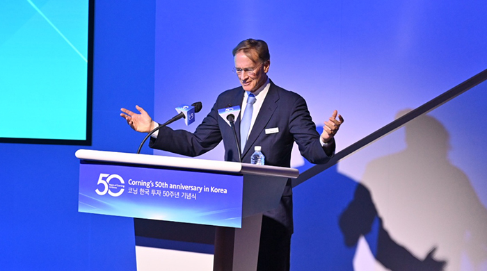 코닝은 1일 오전 아산 탕정 디스플레이시티 코닝정밀소재 2단지에서 김태흠 충남지사, 이재용 삼성전자 회장, 웬델 윅스 코닝 회장 등이 참석한 가운데 열린 한국 투자 50주년 기념행사에서 이 같이 발표했다.