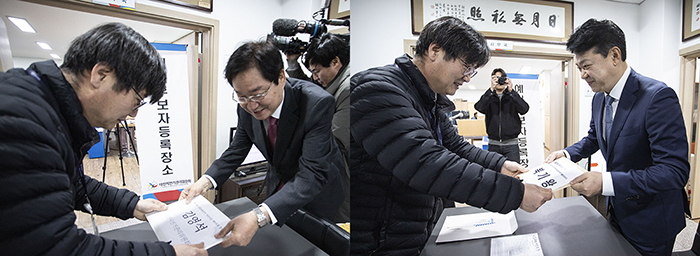 김 전 장관과 복 위원장은 후보등록 개시 20분 전 선관위에 도착했다. 두 예비후보는 서로의 손을 맞잡으며 공정 경쟁을 다짐했다.