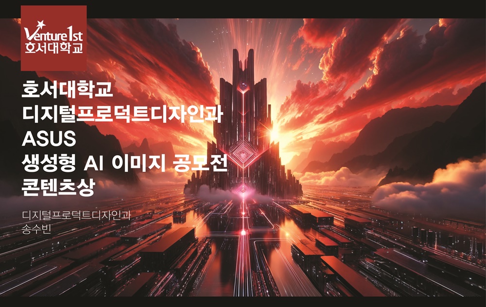 [아산신문] 호서대학교(총장 강일구)는 디지털프로덕트디자인학과 1학년 송수빈 학생이 ‘ASUS 생성형 AI 활용 이미지 공모전’에서 ‘콘텐츠상’을 수상했다고 밝혔다.