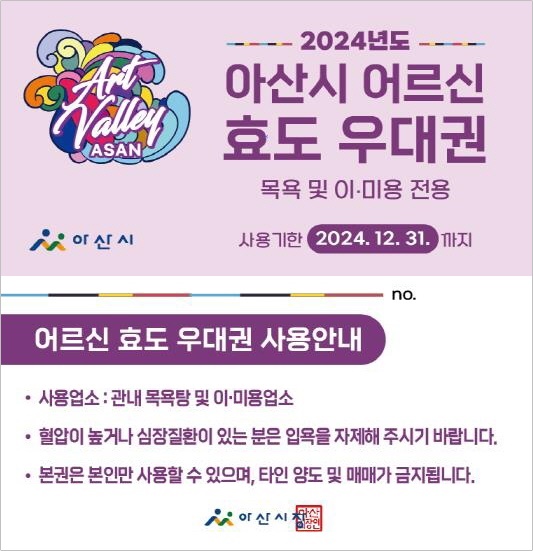 한편 시는 2011년부터 아산시에 주민등록을 두고 거주하고 있는 65세 이상 어르신들의 건강과 복지 증진을 위해 ‘어르신 효도우대권 지원사업’을 추진하고 있다.