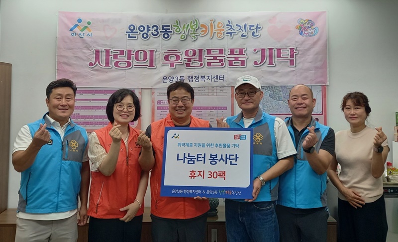 [아산신문] 나눔터봉사단(단장 이은성)이 어제(23일) 온양3동 행복키움추진단에 휴지 30팩을 전달했다고 밝혔다.