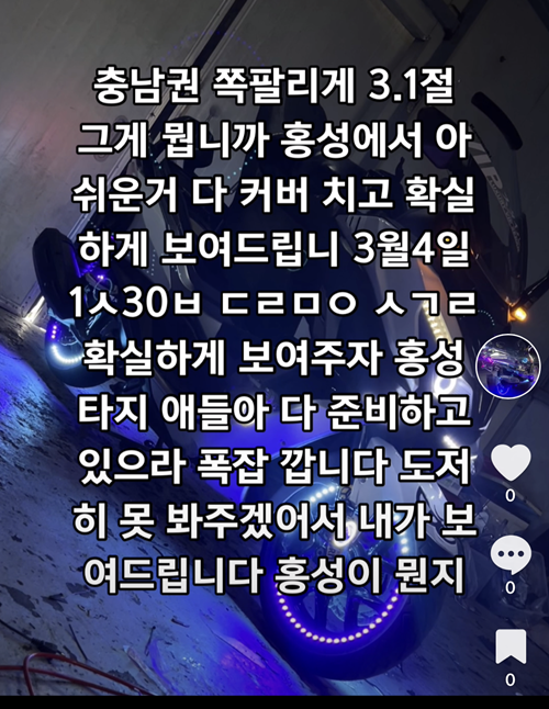 2일 충남경찰청 교통조사계에 따르면 10대인 A군이 틱톡에 충남권 쪽팔리게 3.1절 그게 뭡니까 홍성에서 아쉬운 거 다 커버치고 확실하게 보여드립니다. 3월 3일 1ㅅ 30ㅂ ㄷㄹㅁㅇ ㅅㄱㄹ 확실하게 보여주자 홍성 타지 애들아 다 준비하고 있으라 폭잡 갑니다 도저히 못 봐주겠어서 내가 보여드립니다. 홍성이 뭔지” 공지글을 올려진 것 첩보를 입수하고 수사에 착수했다.