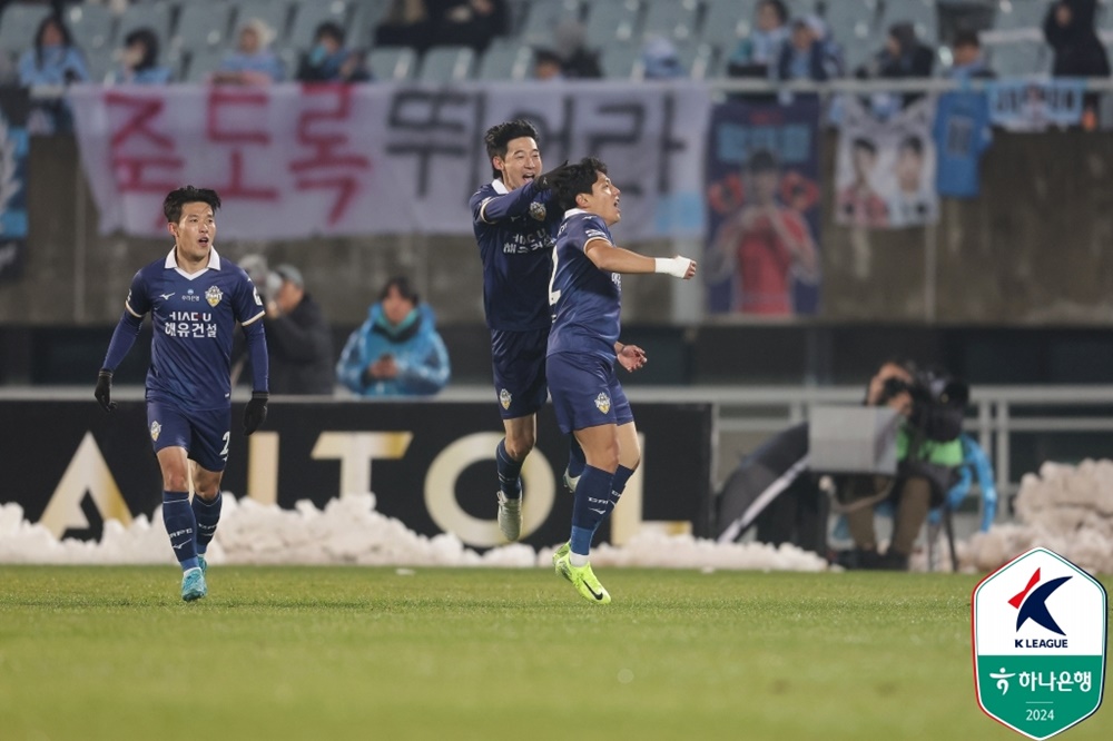 아산은 28일 천안종합운동장에서 열린 하나은행 K리그2 2024 승강 플레이오프 1차전 K리그1 대구FC(이하 대구)와 경기에서 박대훈의 멀티골과 브라질 듀오 주닝요, 데니손의 활약에 힘입어 4:3으로 이겼다.