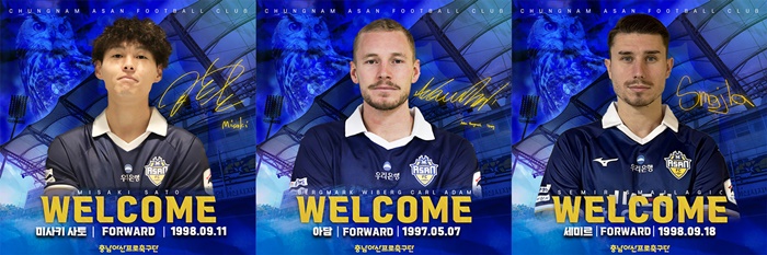 아산 구단은 공격 포지션에서 활동할 일본 출신의 미사키, 아담(스웨덴), 세미르(보스니아 헤르체고비나)를 영입했다고 22일 밝혔다.