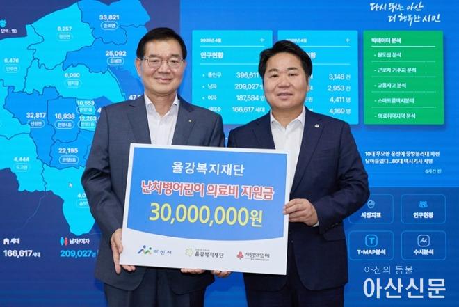 [아산신문] 아산시는 지난 12일 시청에서 사회복지법인 율강복지재단으로부터 저소득 소아암 환자 치료비 지원을 위한 후원금 3000만 원을 전달받았다고 14일 밝혔다.