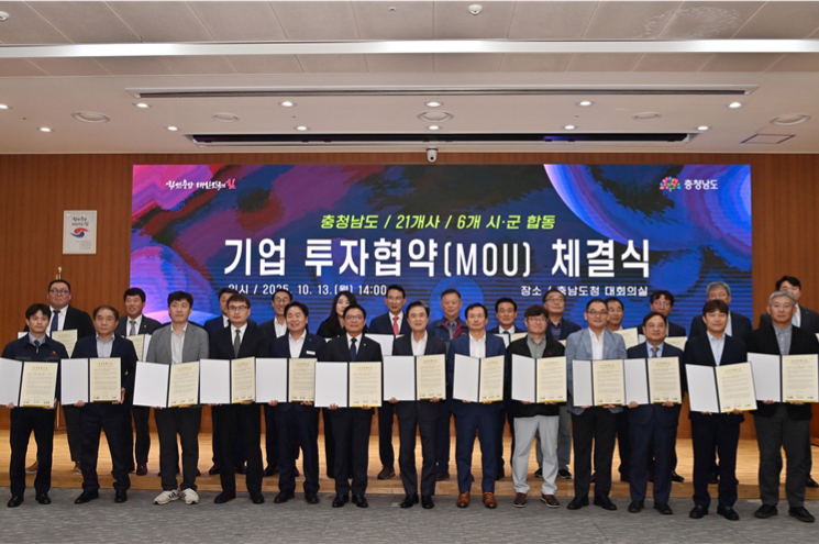 충남도는 이날 도청 대회의실에서 천안시·아산시 등 6개 시군과 국내외 21개 기업과 함께 투자협약을 체결했다.