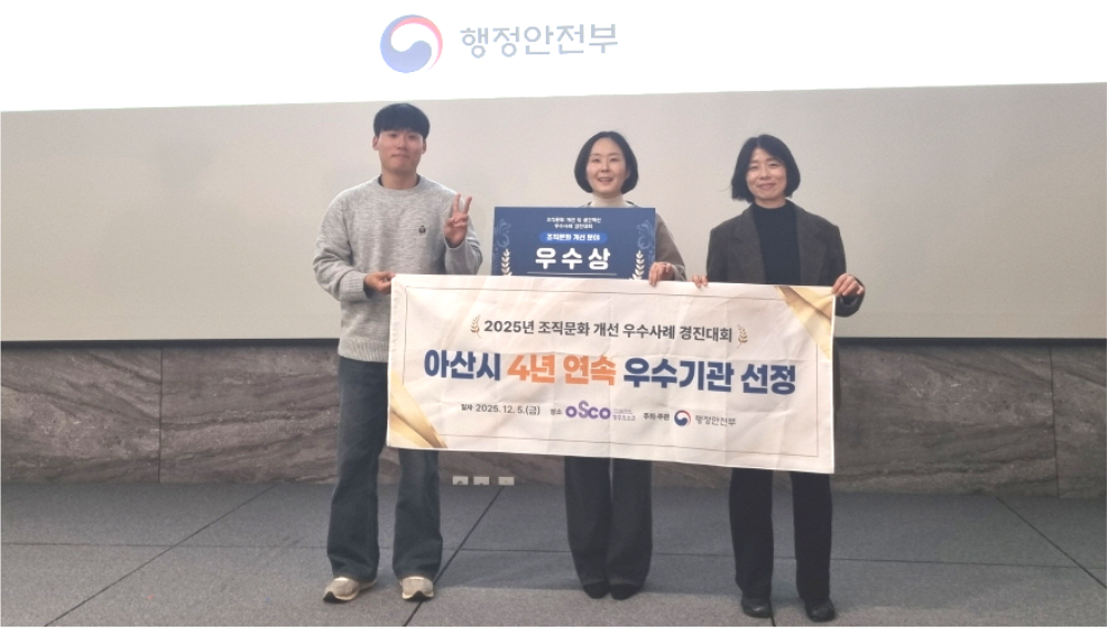 [아산신문] 충남 아산시가 행정안전부 주관 '2025 조직문화 개선 우수사례 경진대회'에서 우수상을 받았다고 9일 밝혔다.