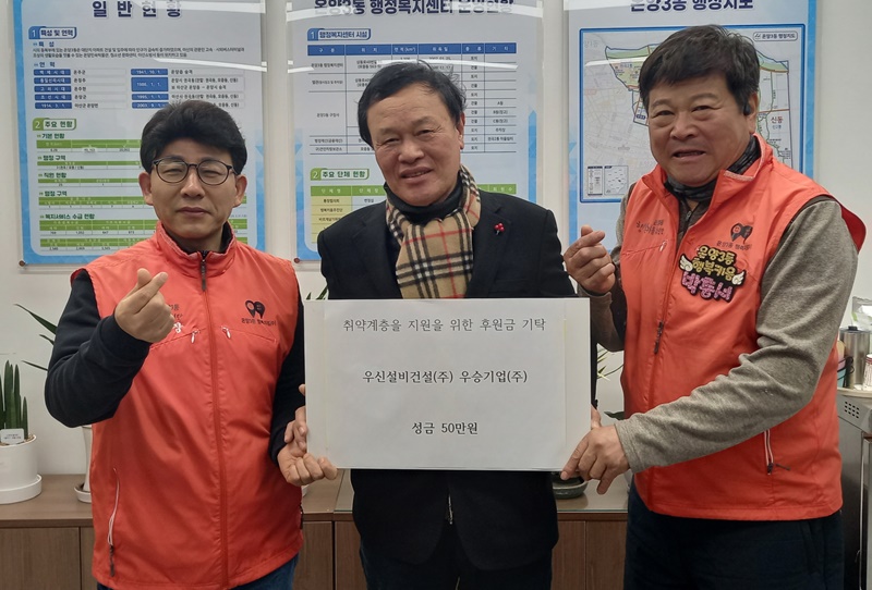 임승근·박충서 공동단장은 “지역 복지에 관심을 갖고 따뜻한 나눔을 실천해 주신 우신설비건설㈜에 감사드린다”며 “기탁금은 도움이 필요한 가구에 소중히 사용하겠다”고 전했다.
