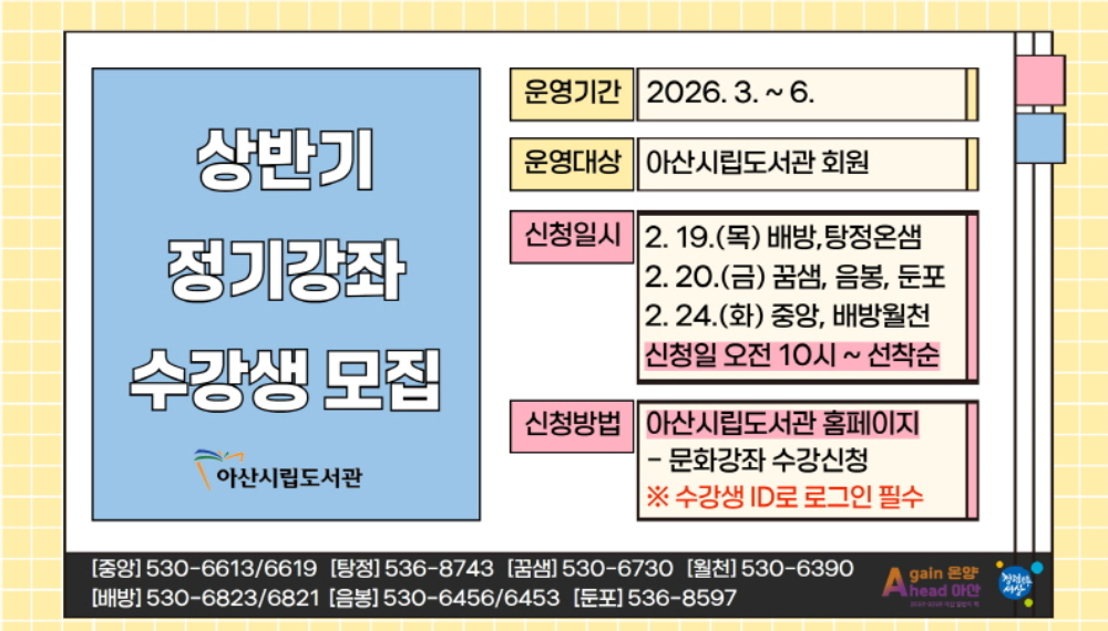 [아산신문] 아산시가 19일부터 아산시립도서관 상반기 정기강좌 수강생을 모집한다.